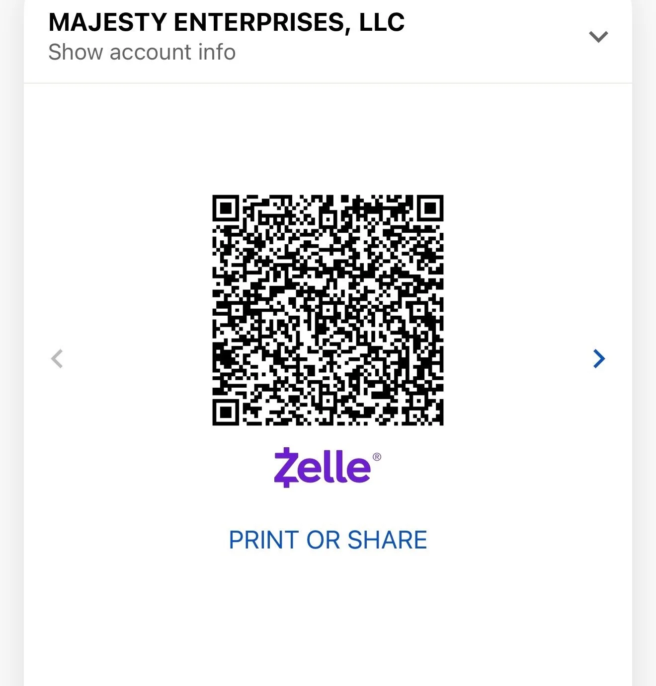 Scan our QR code shown below. (It will say “Majesty Enterprises, LLC uses this code. That is us! It is our legal Business name.)